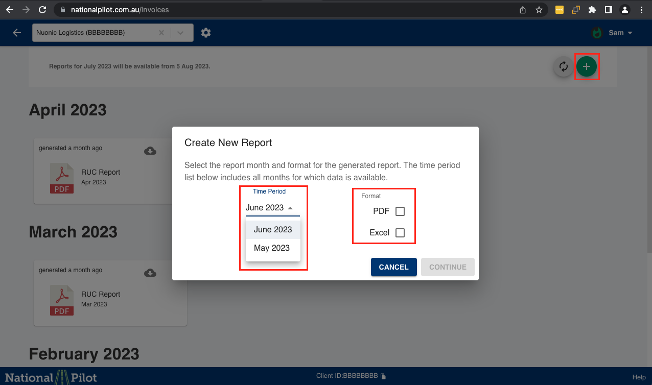Upon selecting the "Download Reports" tab, proceed by choosing the desired months for which you would like to access downloadable reports. Additionally, indicate the preferred report formats you wish to download. Subsequently, click on the "Continue" button to proceed with the request.