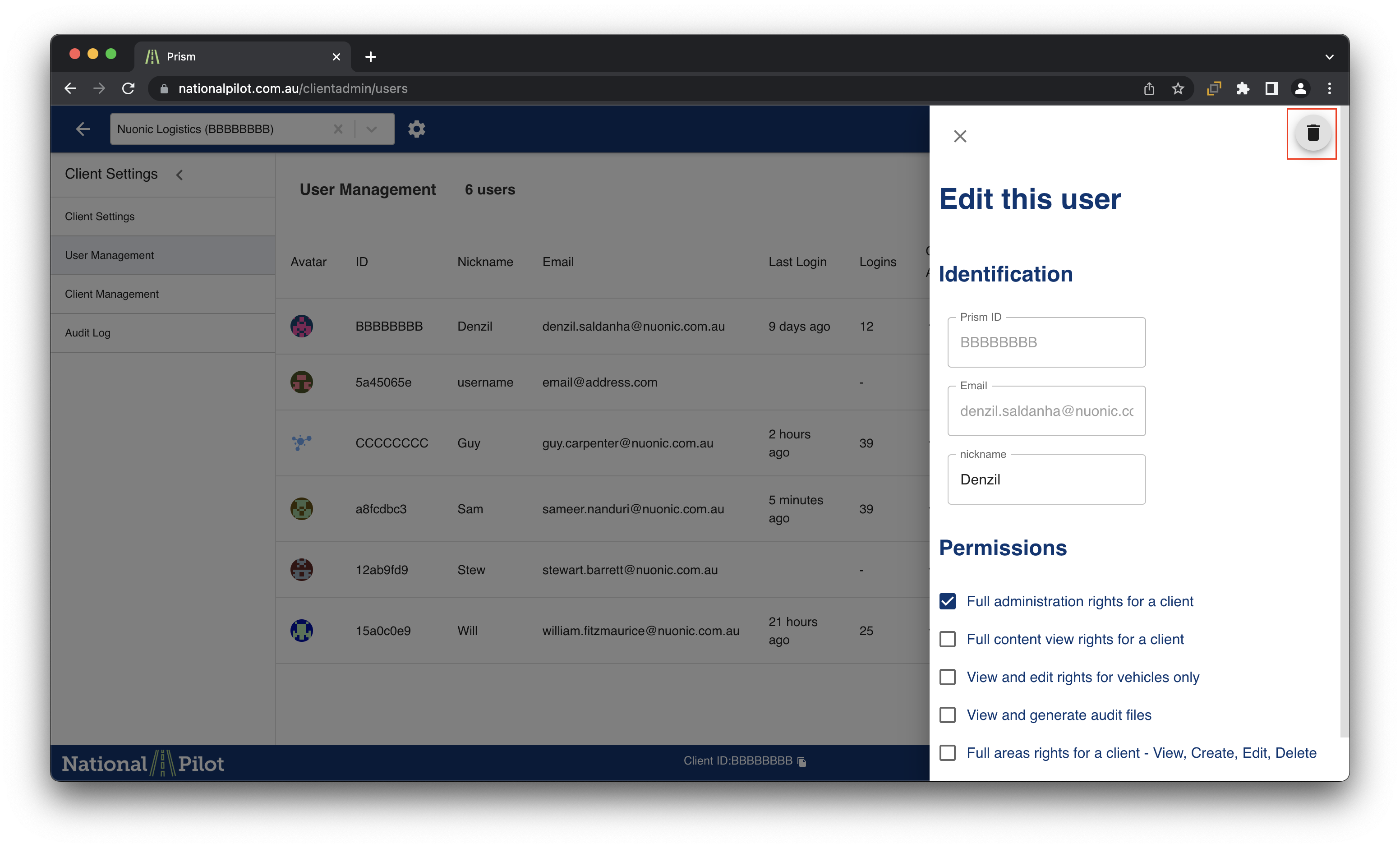 From the edit user pane, select the ‘bin’ option on the top right corner to remove the user.