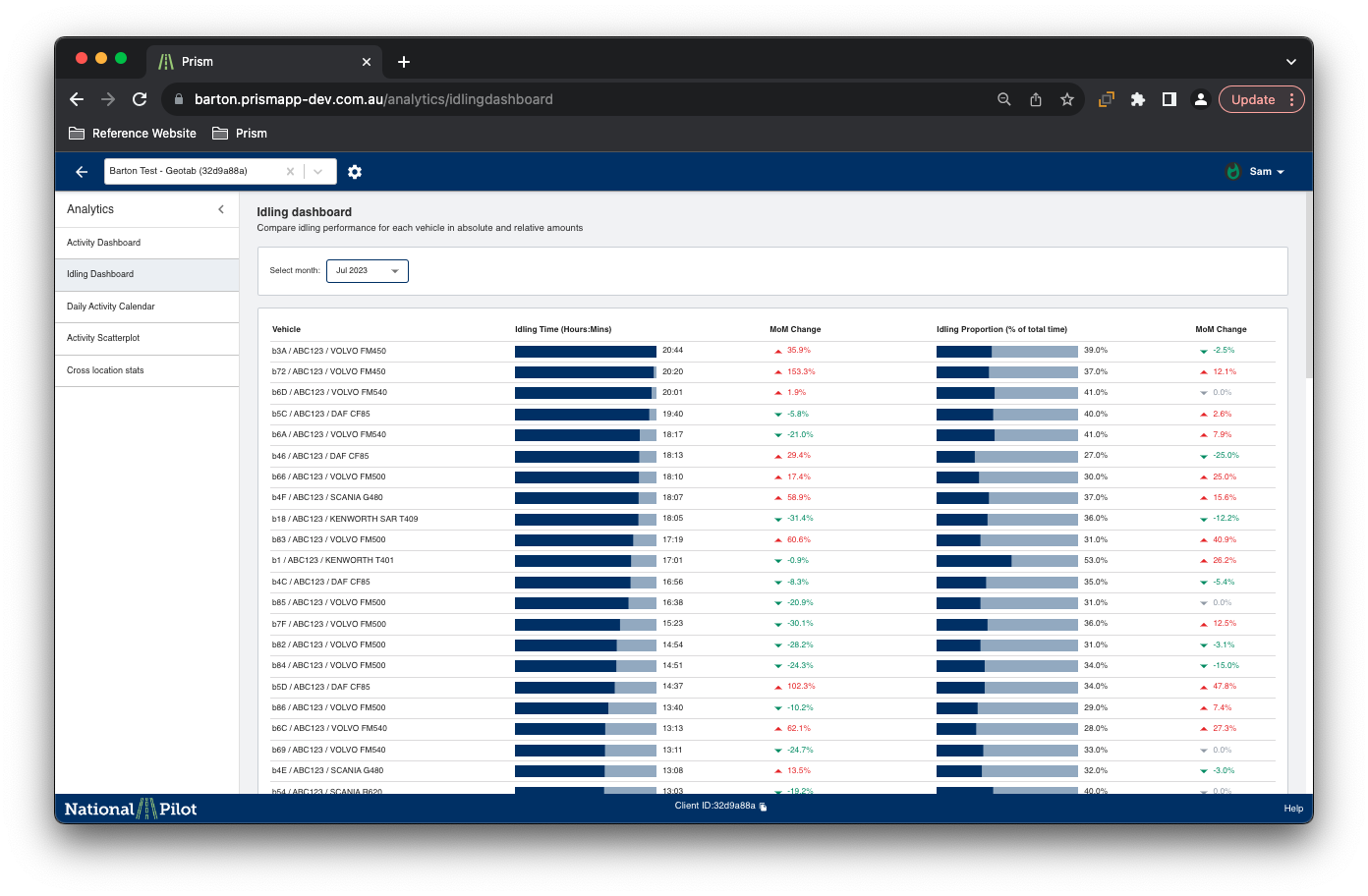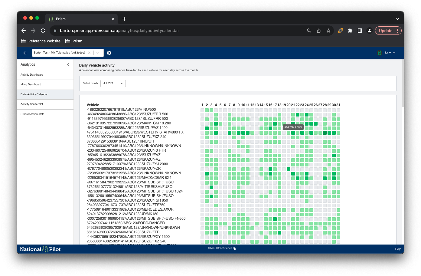 The idling dashboard is a comprehensive and detailed visualisation tool that provides insights into individual vehicle idling times over the course of a month. It presents a visual representation of idling behaviour, allowing users to track how long each vehicle remains idle during different time periods.