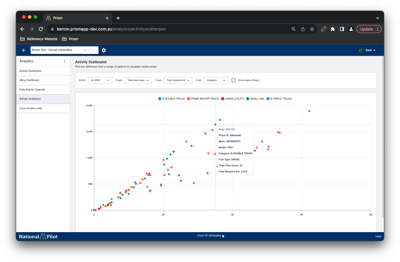 The activity scatterplot page offers users a range of visualisation options to analyse various vehicle activities, such as average speed against average trip distance, idling time percentages, and more.