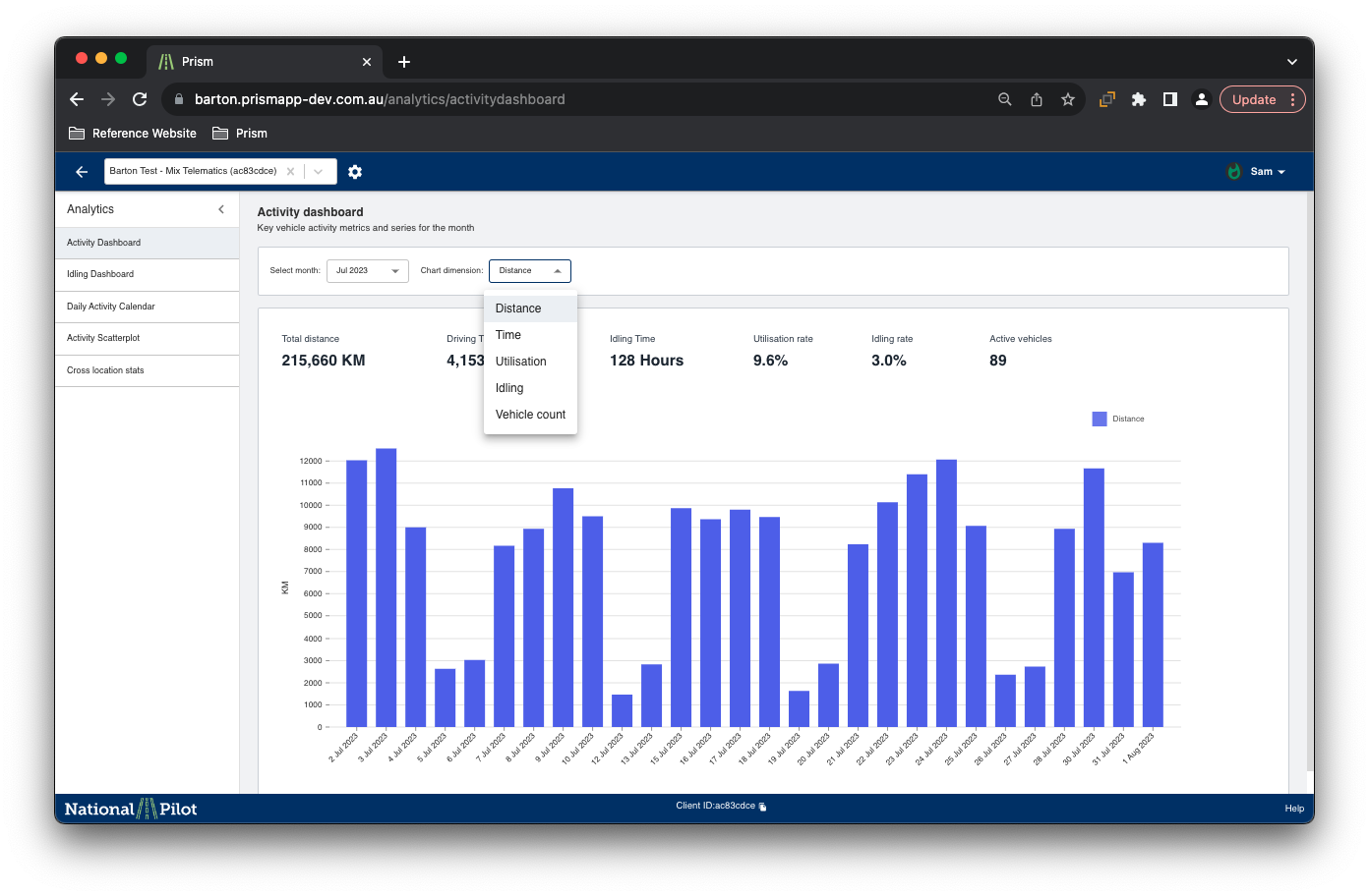 This page presents an interactive graph that visually represents data for different days of the month. It showcases optional features such as distance, time, utilisation, idling, and vehicle count. By interacting with the graph, users can gain valuable insights into the performance and activities of vehicles throughout the month.