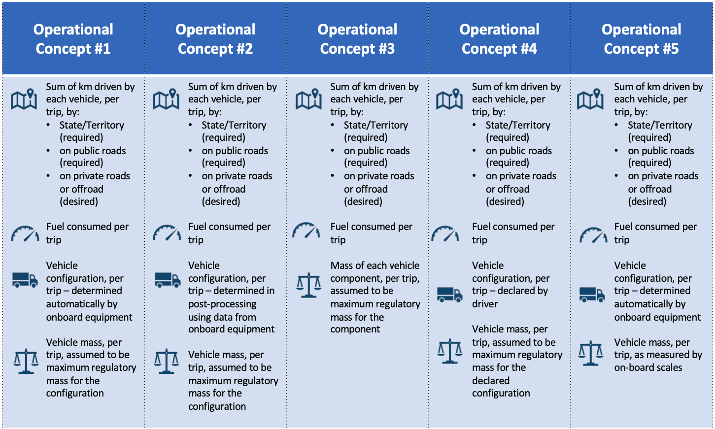 This Key concepts page would provide an overview of the logical concepts of operations used in this trial, including six Concept of Operations (ConOps) models to calculate Road User Charges for multi-component vehicle configurations and the existing fuel excise based PAYGO charges calculation method.