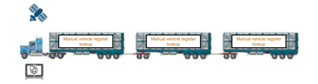 No Concept of Operations involves automatic reporting of configuration by component where the telematics device is installed in the prime mover of the vehicle. In this configuration, the vehicle configuration is reported through a manual vehicle register. The telematics system reports information on fuel consumed.
