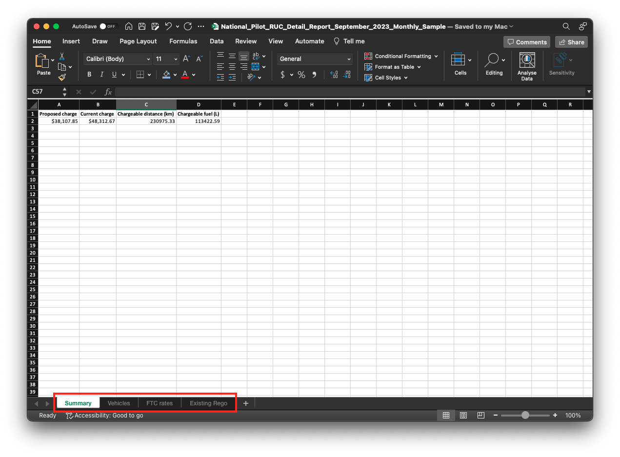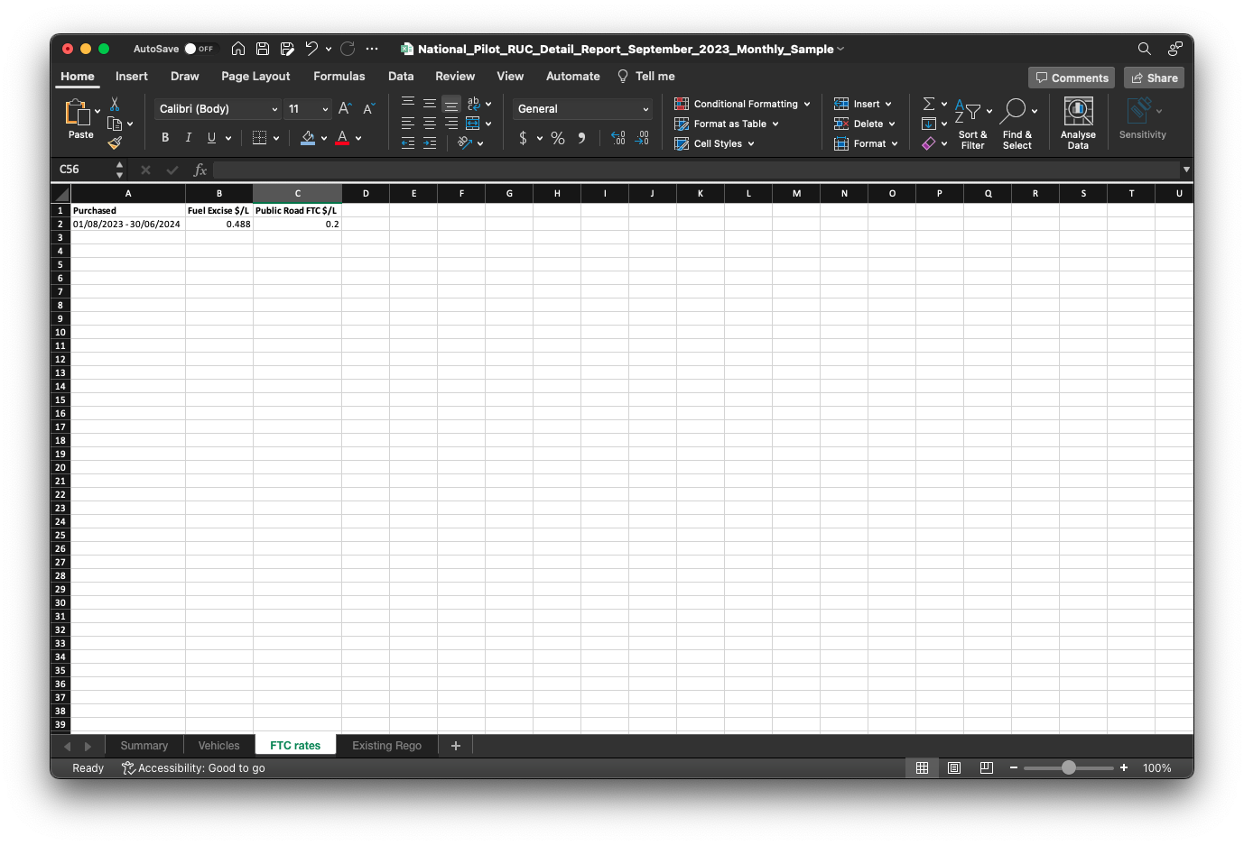 Within the FTC rates tab, you will find valuable information related to each vehicle's purchase date, as well as the corresponding fuel excise rate in dollars per litre ($/L) and the Public road FTC rate in dollars per litre ($/L). This tab serves as a valuable resource to track and understand the specific rates associated with fuel excise and public road FTC for different vehicles in a simple and accessible manner.